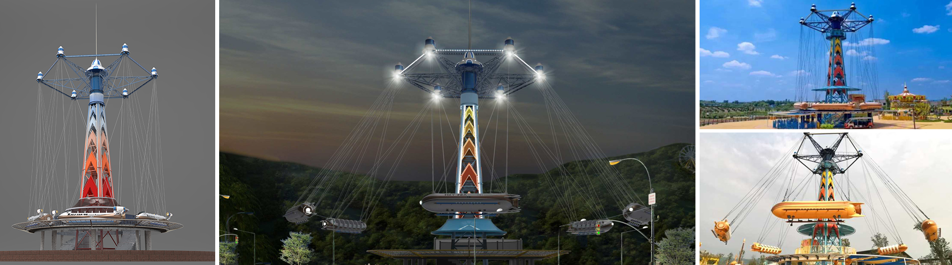 幻速追影六個飛機吊掛座艙隨同旋轉(zhuǎn)架相對塔體自由旋轉(zhuǎn)并外擺升起,繞中心立柱飛行,科幻又刺激。夜間智能燈光系統(tǒng)亮起,成為樂園一道的奇趣風景線。