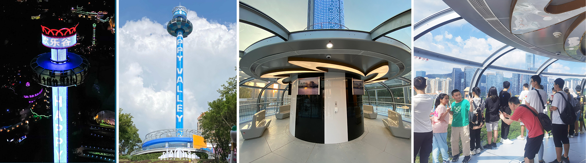 觀景塔擁有可容納100人的“甜甜圈”旋轉(zhuǎn)艙體,載客能力強(qiáng)。雙自動(dòng)門進(jìn)出口的設(shè)計(jì)便于快速上下客,運(yùn)營(yíng)高效。乘客在旋轉(zhuǎn)艙中360°環(huán)繞式縱情飽覽四周美景,還可通過艙內(nèi)影音系統(tǒng)感受多元視覺盛宴。夜幕降臨燈光閃耀,璀璨奪目輕易打造夜場(chǎng)焦點(diǎn),成為聚客地標(biāo)。