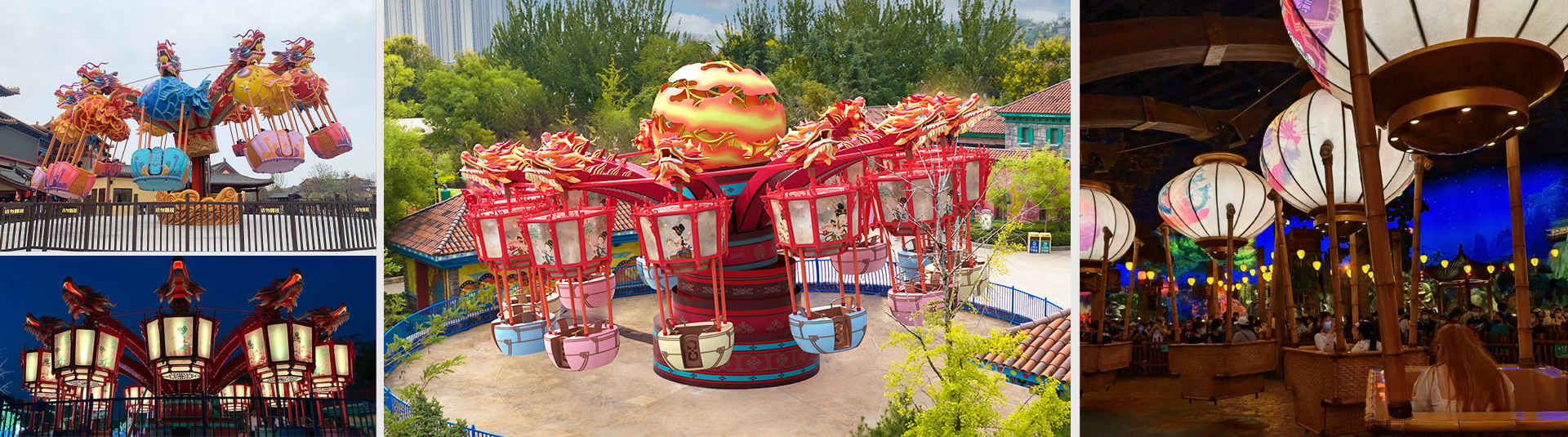 逍遙花燈集旋轉(zhuǎn)、升降運(yùn)動(dòng)形式于一體。在運(yùn)行過程中,轉(zhuǎn)盤會(huì)以15°的傾?進(jìn)行旋轉(zhuǎn),乘客在吊籃中邊體驗(yàn)離心力作用下的外擺及高低起伏的回旋飄蕩,邊欣賞燈籠光影變幻下的皮影故事。